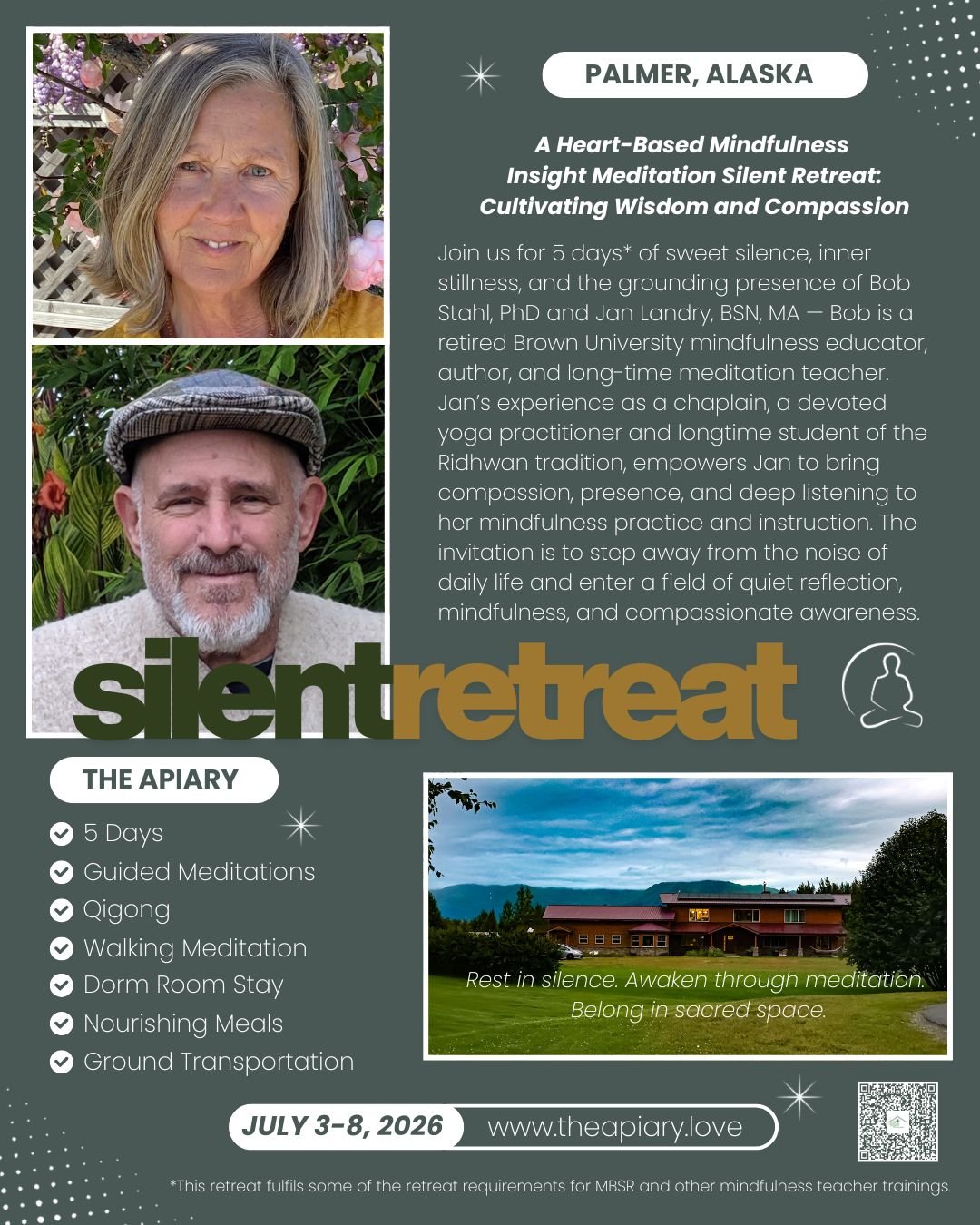 Sacred Hospitality Store Categories: All Accommodations Retreat Registration All | Accommodations | Retreat Registration | A Heart-Based Mindfulness Insight Meditation Silent Retreat: Cultivating Wisdom and Compassion $900.00 Red Tent - (Sue)sitna Room - Sliding scale available $50.40 Red Tent - (Matt)anuska Room - Sliding scale available $50.40 Red Tent - Moon Room $100.80 Red Tent - Southeast Room - Sliding scale available $151.20